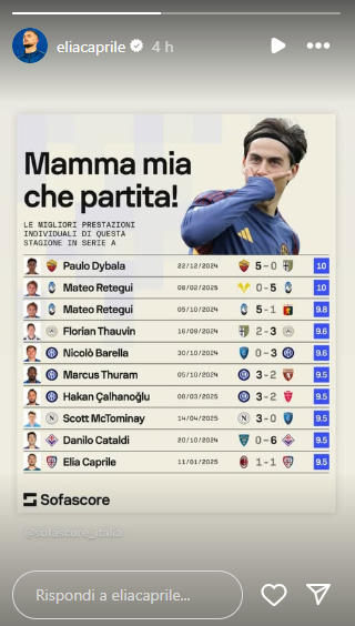 A proposito di prestazione top, Caprile rientra nella classifica stilata da Sofascore sulle migliori prestazioni individuali di questa annata: infatti ha ricevuto una media del 9.5 per la performance eseguita all’esordio in rossoblù l’11 gennaio scorso durante il match contro il Milan terminato 1-1. Lo stesso giocatore ha condiviso questo traguardo in una storia sul profilo Instagram.