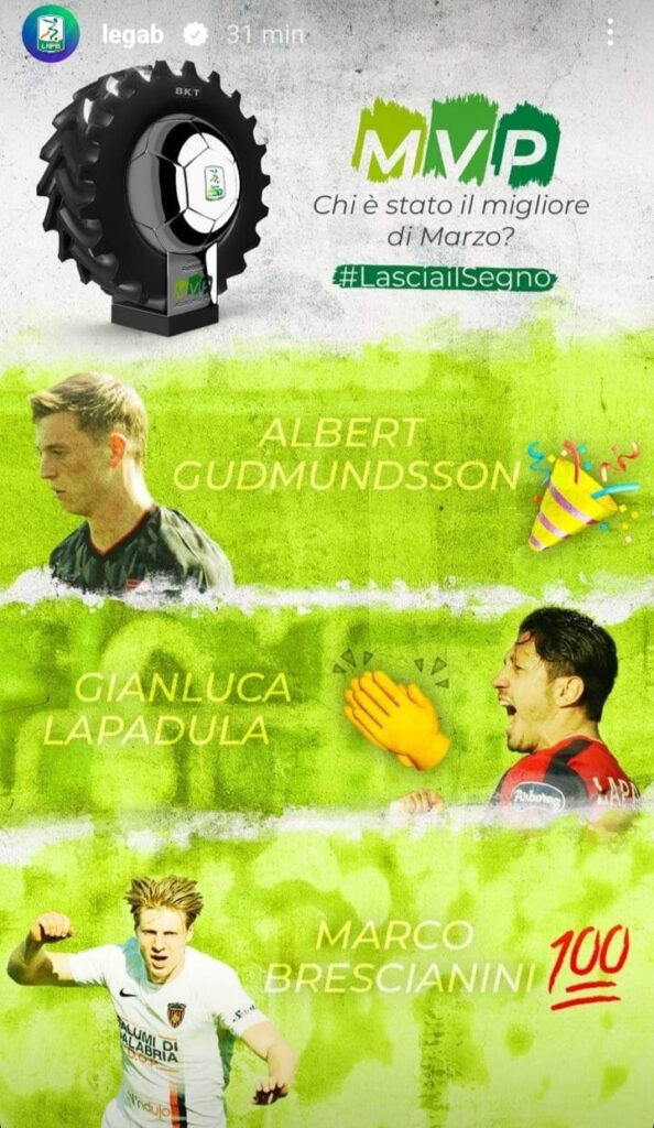 Le prestazioni della punta centrale di Cagliari e Perù, Gianluca Lapadula, stanno crescendo sempre di più ed con una progressione che è capace d’impressionare i tifosi (e non). L’ex giocatore di Milan e Genoa ha segnato ben cinque reti nelle tre partite andate in scena nell’ultimo mese, tale che la Lega di Serie B ha deciso di inserirlo nella lotta a tre per il titolo di MVP di marzo, tramite i propri canali social; gli altri due giocatori in lizza sono Albert Gudmundsson del Genoa e Marco Brescianini del Cosenza. Questo il post: