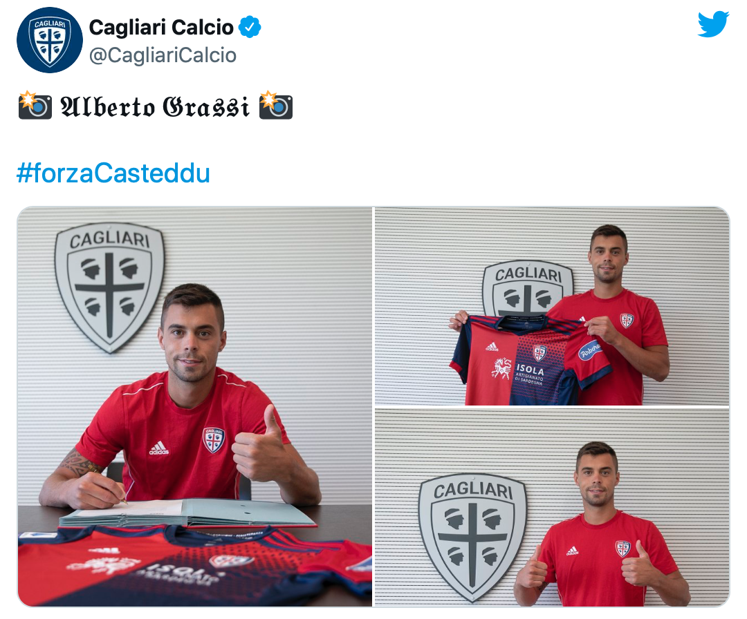 «Il Cagliari Calcio è lieto di annunciare l’acquisto dal Parma del diritto alle prestazioni sportive del calciatore Alberto Grassi che arriva in rossoblù con la formula del prestito con obbligo di riscatto al verificarsi di determinate condizioni sportive.