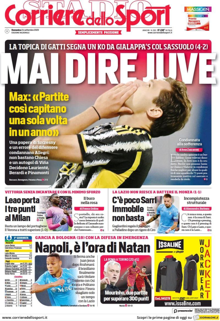Le prime pagine dei Quotidiani Sportivi di Oggi, 24 settembre: Tuttosport, Gazzetta dello Sport e Corriere dello Sport