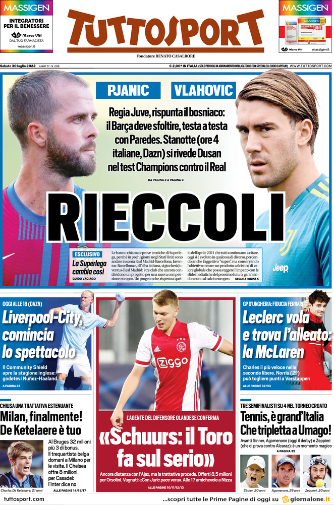 Le prime pagine dei Quotidiani Sportivi di Oggi, 30 luglio: Tuttosport, Gazzetta dello Sport e Corriere dello Sport