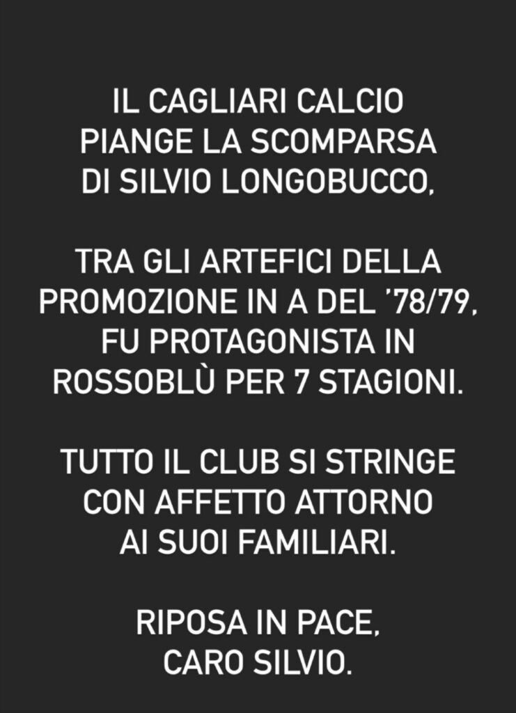 «Il Cagliari Calcio piange la scomparsa di Silvio Longobucco. Fu protagonista per 7 stagioni. Tutto il club si stringe con affetto ai suoi familiari. Riposa in pace, caro Silvio».