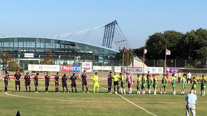 La formazione della Primavera in campo nel primo tempo: Atzeni, Acella, Aly, Iovu, Zinfollino, Kanyamuna, Marigosu, Lombardi, Cossu, Cannas, Contini.