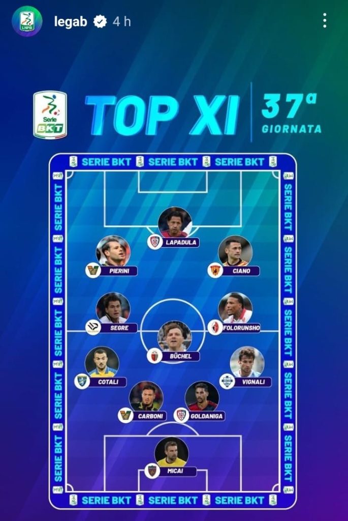 Nella 37a giornata del campionato di serie BKT 2022-2023 il Cagliari di mister Claudio Ranieri ha ribaltato il vantaggio iniziale del Palermo per poi conquistare tre punti fondamentali nella corsa al quarto posto, al momento occupato dal Sudtirol dell’ex Bisoli. Nel corso del “derby delle isole” si sono distinti per le rispettive prestazioni tanto l’attaccante Gianluca Lapadula quanto il difensore Edoardo Goldaniga. Le loro prove hanno indotto gli account social della Lega Serie B ad inserire entrambi nella Top 11 della giornata. Questa la formazione: